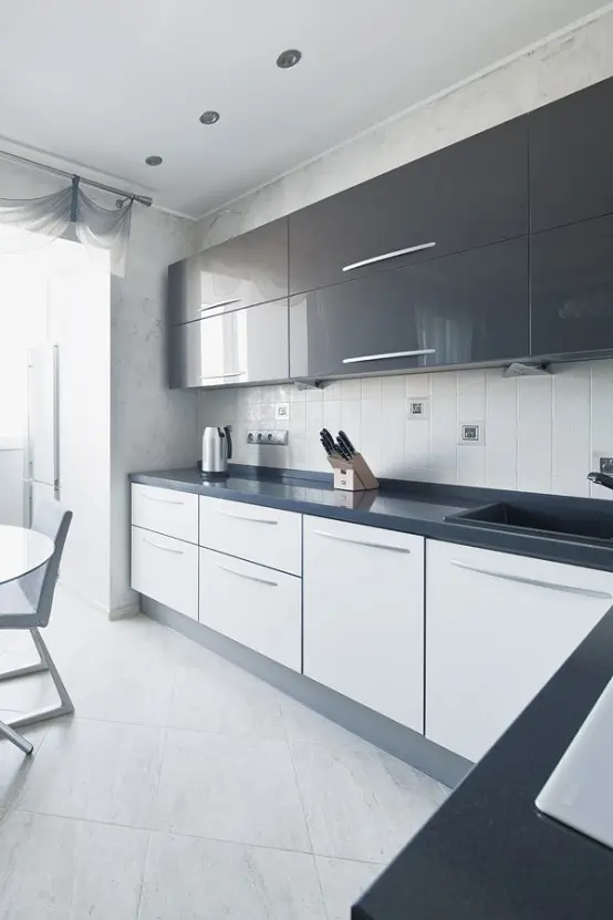 Modele de bucatarii cu paleta neutra de culori: gri si alb si suprafete netede, lucioase contureaza acest spatiu amenajat in stil minimalist