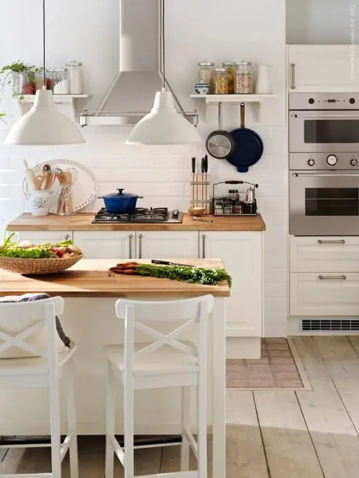 Bucatariile cu mult alb sunt luminoase si ofera o atmosfera deschisa, calda. Lemnul este o aditie perfecta, in forma podelei sau a altor piese de mobilier care ofera un plus de caldura incaperii. Tot in categoria elementelor naturale intra si piatra care, de asemenea, poate fi integrata in bucatarie, ca structura a blatului de lucru.