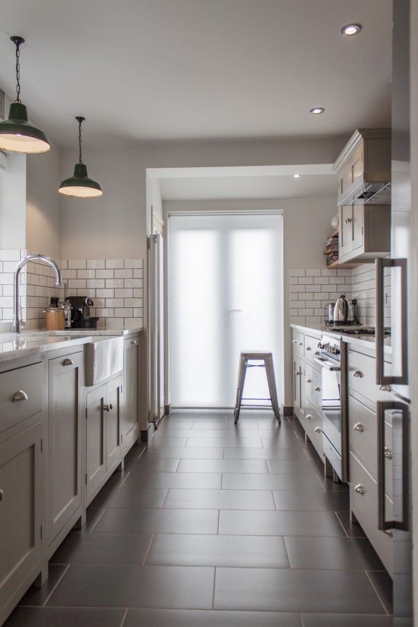 Modele de bucatarii cu paleta neutra de culori: un perete accent cu gri seteaza punctul de interes al spatiului