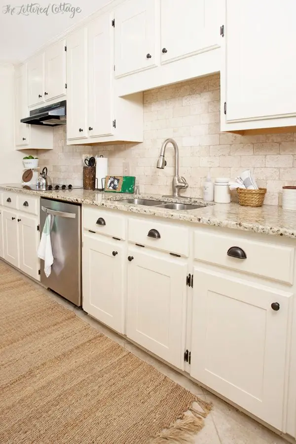 Modele de bucatarii cu paleta neutra de culori: flise albe pana la jumatatea peretului si mult mobilier alb