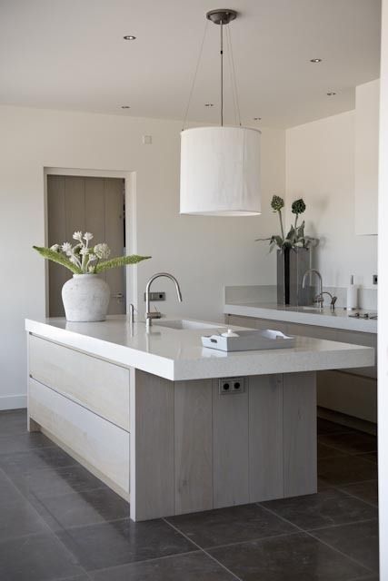 Modele de bucatarii cu paleta neutra de culori: griurile deschise si suprafetele netede contureaza liniile unui spatiu modern