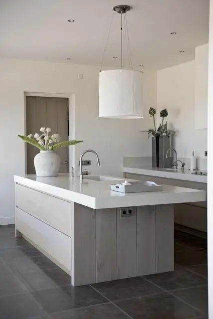 Modele de bucatarii cu paleta neutra de culori: mult alb si gri deschis care ofera o atmosfera placuta incaperii
