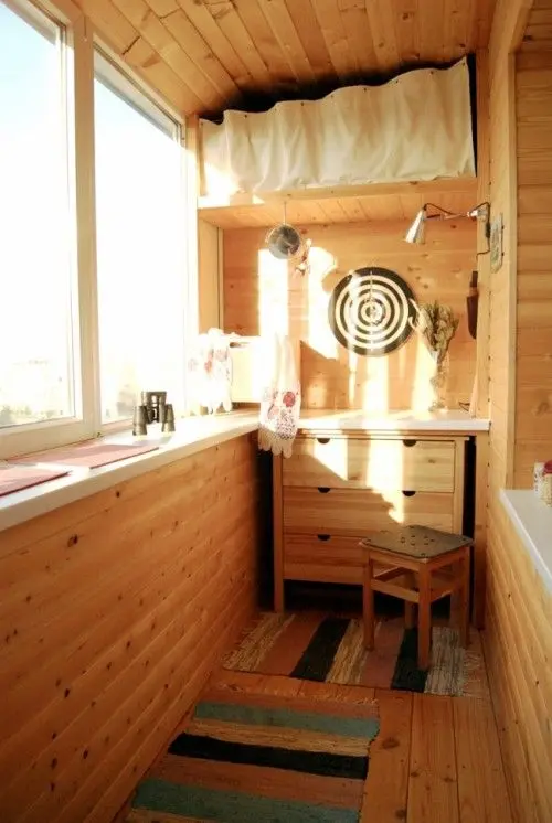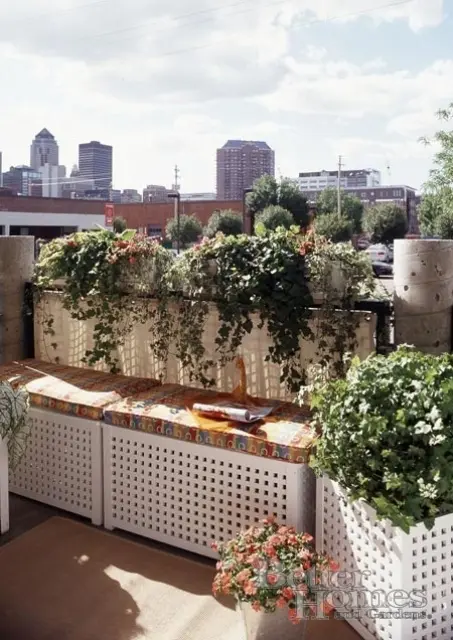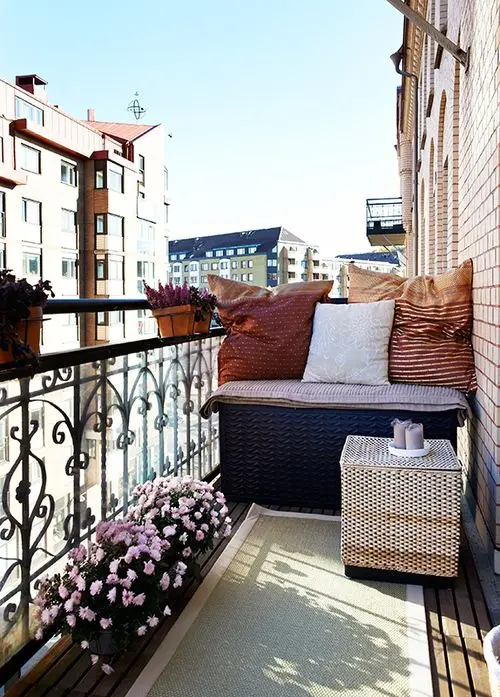 construieste-ti lazi de depozitare pe dimensiunea balconului pentru a folosi tot spatiul pe care il ai la dispozitie. Imbraca lazile cu o husa si pune deasupra si niste pernute pentru a avea un loc unde sa iti bei cafeaua.
