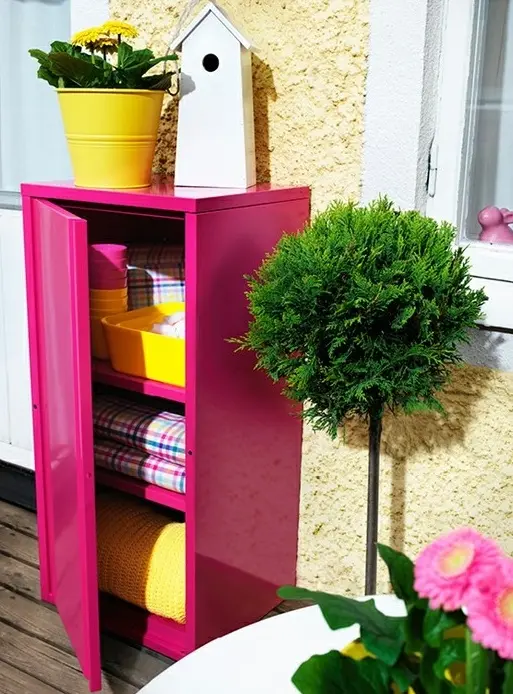 foloseste fisete metalice pentrudepozitare. Astfel poti sa tii pe balcon si tesaturi, asternuturi sau haine fara sa iti fie teama ca se pot uda, in cazul in care ai un balcon deschis. In plus, aceste dulapuri pot fi vopsite foarte usor si asa aduci un strop de culoare in spatiu.