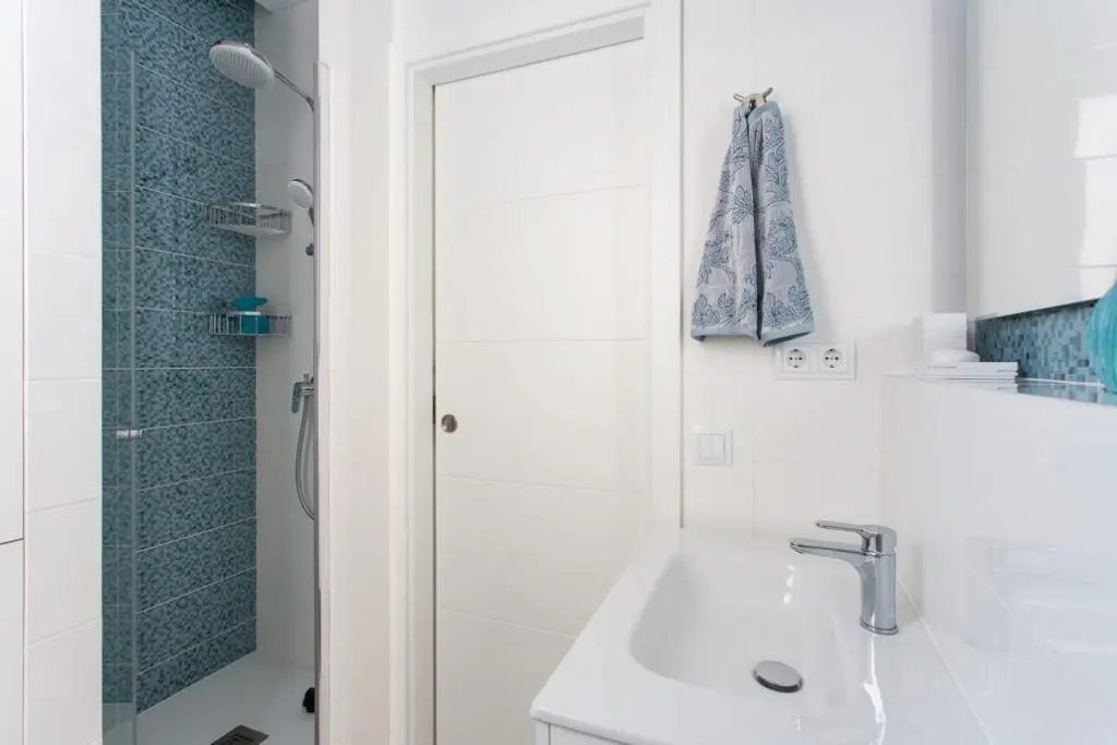Primul model de amenajare zona dusului. De remarcat ca usa este si ea schimbata; s-a ales o usa glisanta din cauza spatiului mic