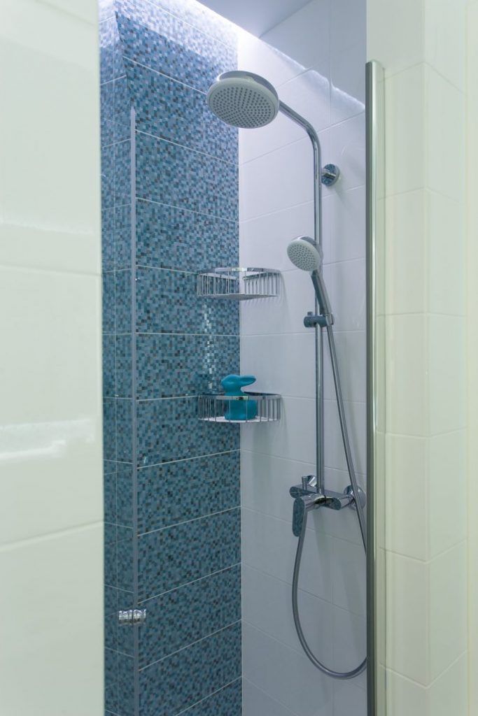 Primul model de amenajare zona dusului. De remarcat ca usa este si ea schimbata; s-a ales o usa glisanta din cauza spatiului mic