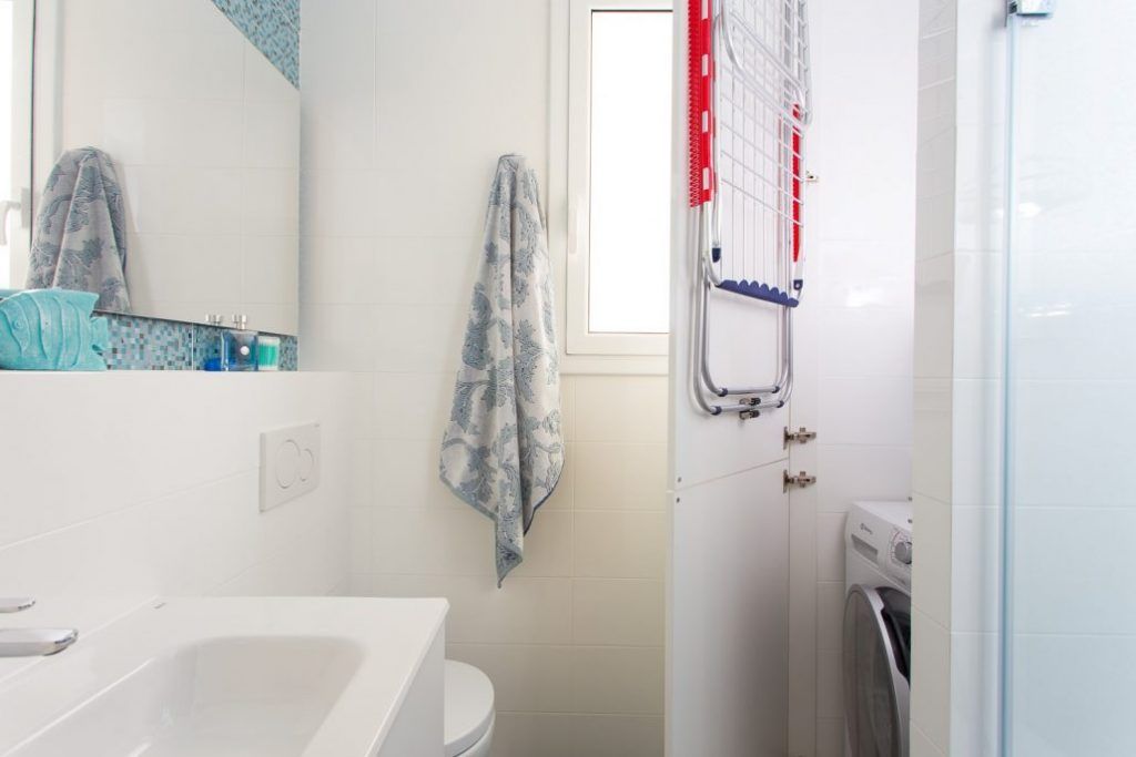 Suprafata acestei bai este mica, insa spatiul este bine optimizat, avand chiar si un spatiu pentru masina de spalat rufe. De cele mai multe ori, in astfel de bai, specialistii recomanda montarea unei cabine de dus in locul unei cazi. Ca si in cazul de faţă, instalarea unui astfel de solutii cu dus a permis si crearea unei zone de depozitare. Practic, a fost ridicat un perete intre dus si dulap, dupa cum vei putea observa si in imaginile din galerie. De cealalta parte a baii, rezervorul toaletei a fost incastrat, iar nisa rezultata permite o zona pentru depozitarea produselor cosmetice sau a unor mici decoratiuni.