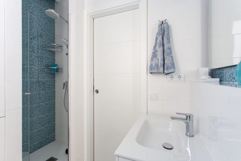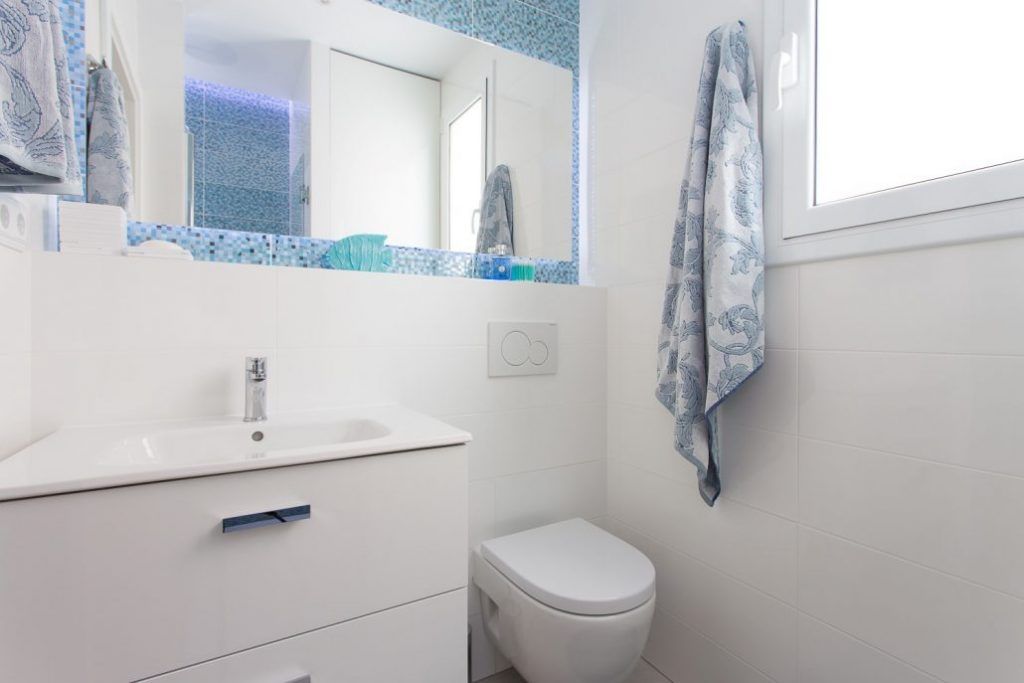 Deschide GaleriaIn prima amenajare, folosirea accentelor de albastru pare a fi solutia confortabila pentru a aduce un plus de interes decorului. Vei remarca ca finisajele si sanitarele sunt albe, inclusiv corpul pentru depozitare de sub lavoar, astfel ca placile cu mozaic albastru ies in evidenta intr-un mod placut.