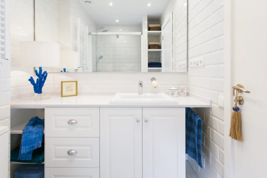 Nevoia de spatii de depozitare a fost rezolvata prin crearea unui tot unitar in jurul lavoarului. Practic, acesta este incorporat intr-un corp de mobilier, cu rafturi deschise, sertare si doua usi, dar si un mic spatiu creat pentru intinderea prosopului. Blatul de deasupra unifica aceste zone, oferind un plus pentru decoratiuni si lampa anterior mentionata. Oglinda supradimensionata (un model care acopera jumatate din peretele cu lavoarul) face ca spatiul sa para mai mare si mai luminos.