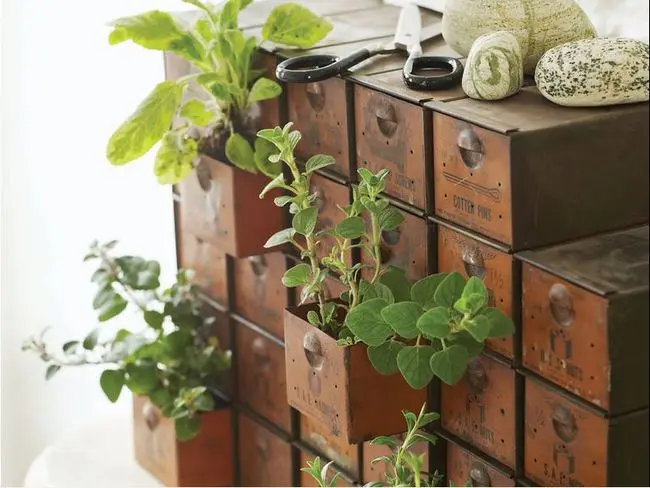 19. In acest mini organizator de metal cu sertare s-au amenajat ghivece pentru flori
