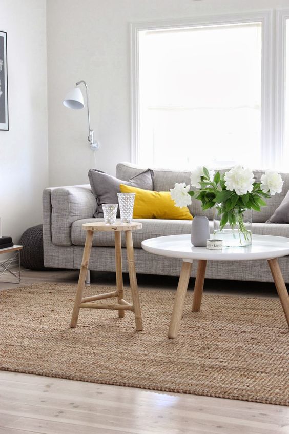 Un living neutru, minimal amenajat accentul de galben si verdele florilor sunt detaliile care fac diferenta