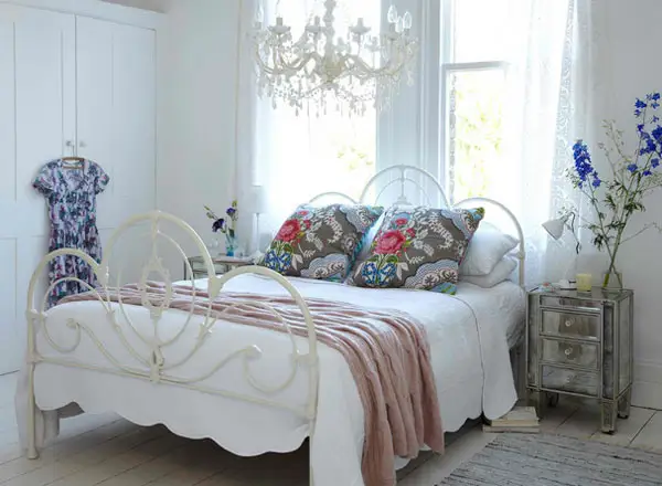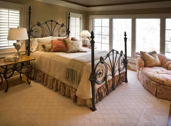 Cadrul metalic pentru pat ofera un aspect somptuos si elegant in acelasi timp. Recomandam sa folositi o lenjerie pe masura, de calitate, lunga, cu o croiala deosebita. Cuverturile cu textura sunt indicate pentru ca intregesc armonios intreg aranjamentul intr-un astfel de dormitor. Nu omiteti nici covorul; va imbraca spatiul armonios si ii va oferi un plus de caldura.