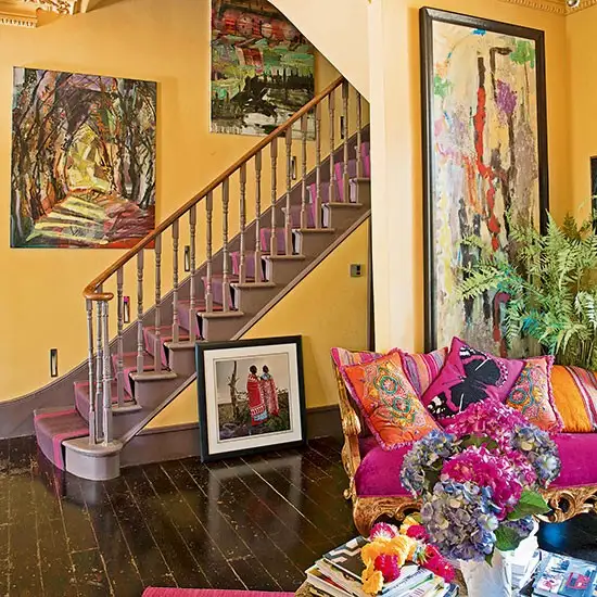 Rozul si galbenul fac un mix reusit pentru amenajarea holului de la intrare