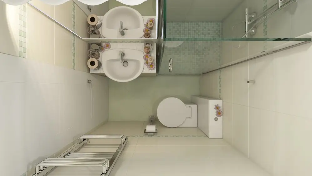 Accentele de verde pal reiau motivul cromatic pe care il regasim in intreaga amenajare. Gresia pentru pardoseala si braurile cu mozaic de pe pereti se imbina armonios cu nuanta predominanta de crem.