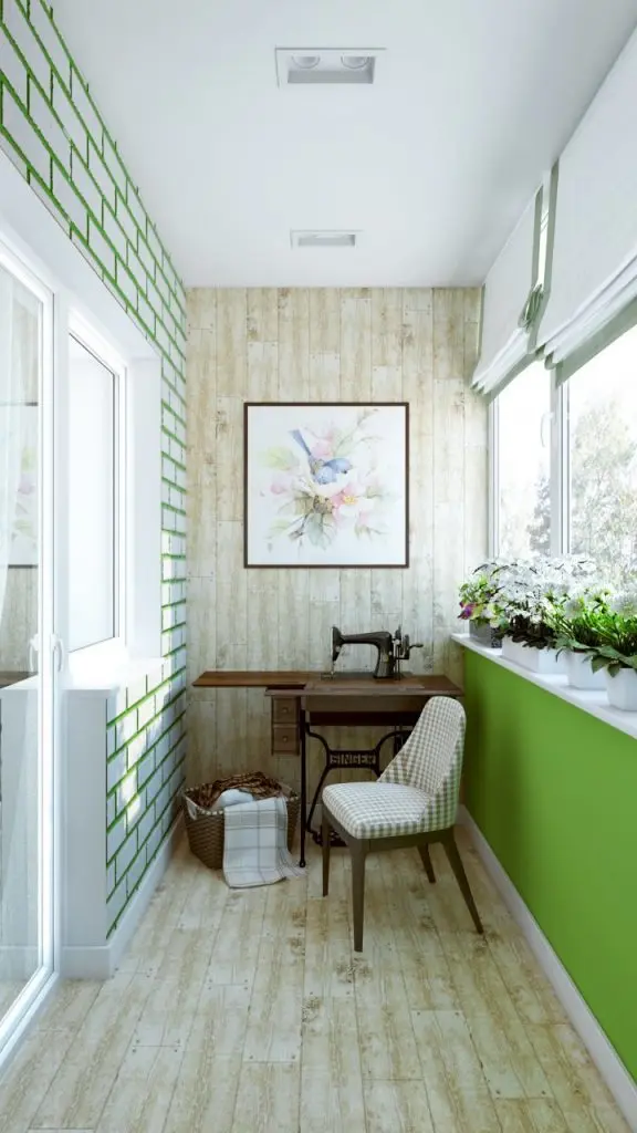 Surprinzator este balconul, care in mod normal ar fi fost integrat in camera pentru un plus de spatiu. Aici, designerul l-a lasat de sine statator, decorandu-l intr-un mod original. Accentele de verde incanta privirea. Ingenios, felul cum caramida originala a fost pastrata dar vopsita in alb, iar spatiile dintre ele vopsite cu verde. Atat pardoseala cat si unul din peretii laterali ai balconului au fost placati cu placi de parchet. Masina de cusut cu un aer vintage este piesa de rezistenta a amenajarii, aici fiind de fapt locul de pus in practica hobby-ul proprietarei. Nu lipsesc plantele pe pervaz. Avem chiar si un dulap cu usi glisante incastrat in perete pentru un plus de depozitare.