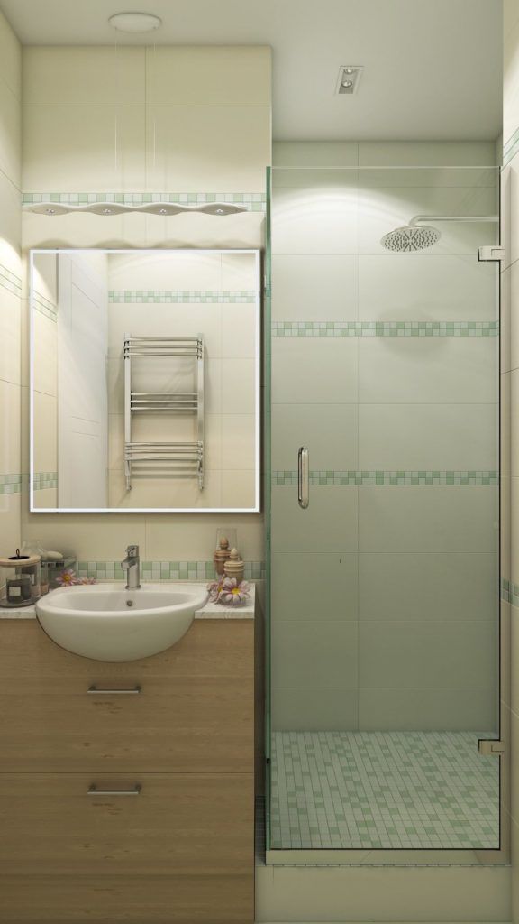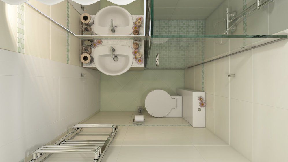 Accentele de verde pal reiau motivul cromatic pe care il regasim in intreaga amenajare. Gresia pentru pardoseala si braurile cu mozaic de pe pereti se imbina armonios cu nuanta predominanta de crem.