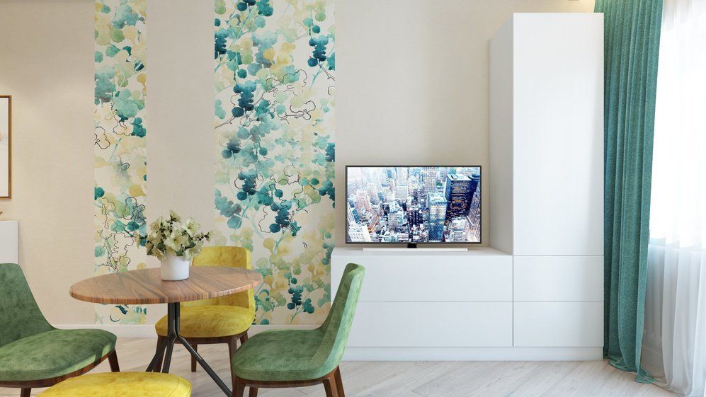 Jocul cromaticii sprijina tot acest efort de a distrage atentia de la dimensiunile spatiului. Astfel, tapetul si mai ales imprimeul sau jucaus contribuie la personalizarea locuintei. Il vom gasi montat pe peretele din spatele canapelei, dar si in dreptul mesei ca o modalitate de a delimita vizual fiecare functiune in parte. Nuantele de turcoaz, spre verde proaspat sunt foarte placute, iar in contextul albului si cremului, ies in evidenta intr-un mod surprinzator. Tonul de baza al amenajarii este unul crem-bej pentru a reflecta lumina si mari spatiul. Lumina naturala patrunde din belsug, iar perdelele albe, translucide sporesc efectul.