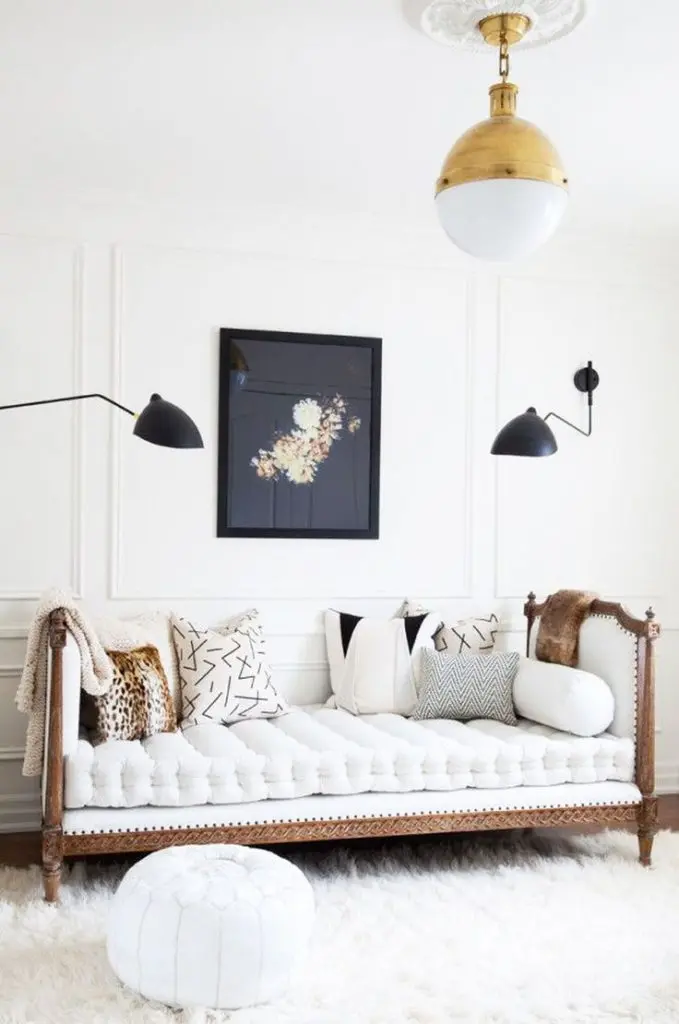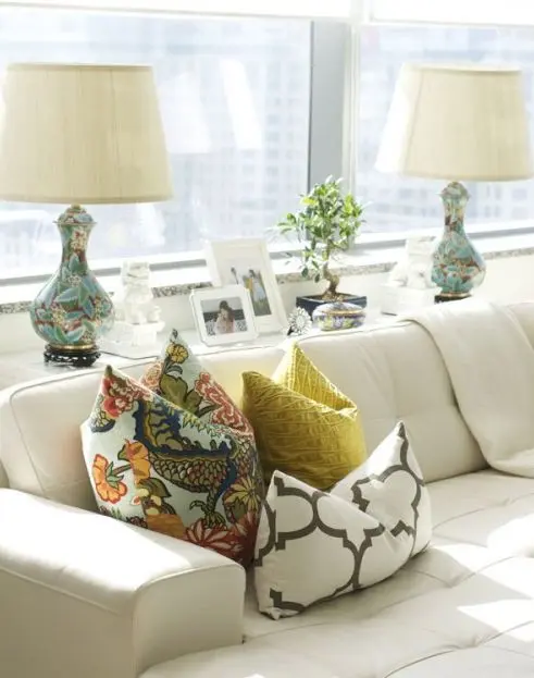O alta modalitate de a mixa pernele este alegerea acestora in functie de fondul pe care sunt printate. De exemplu, combina perne cu diferite printuri, dar care au acelsi fond alb. Din nou, acorda atentie varietatii de printuri, tocmai aceasta va scoate in evidenta elementul care leaga modelele.