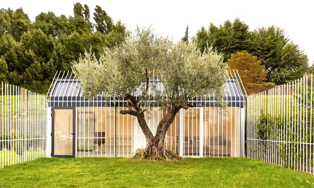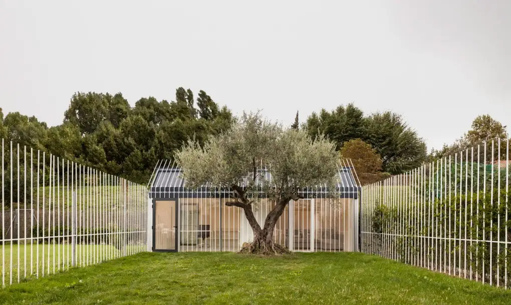 Proprietarii acestei constructii din Spania si-au dorit o casa pentru oaspeti care sa dispuna de doua incaperi. Una dintre ele se afla in interiorul casei, iar cealalta gazduieste copacul din gradina casei.