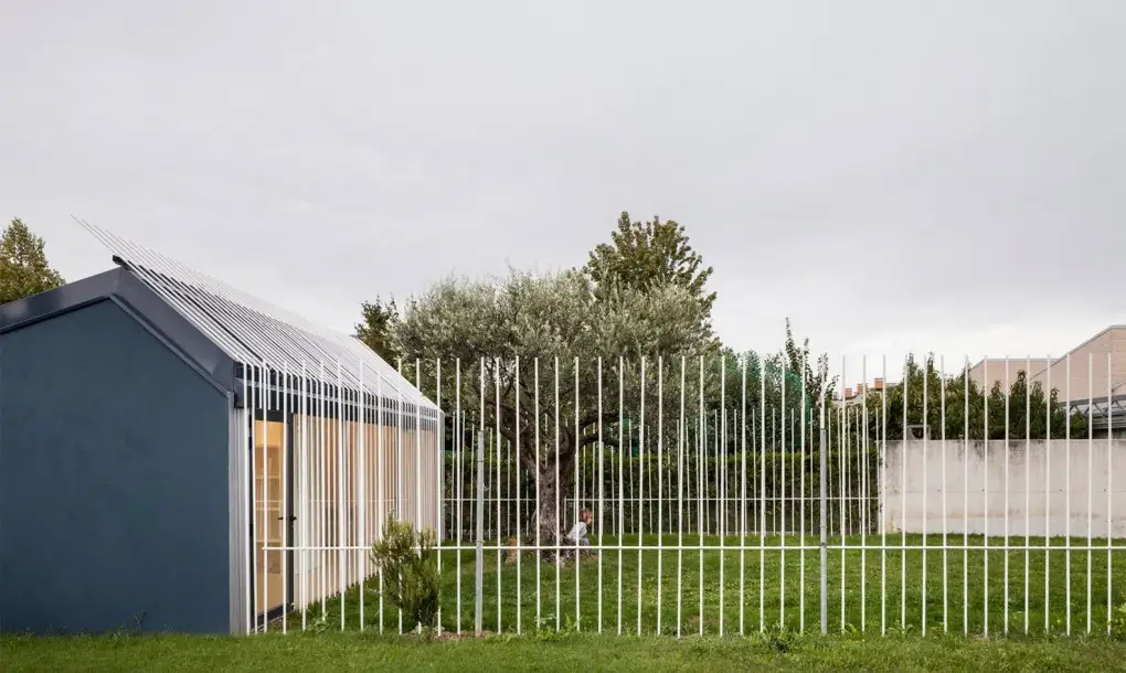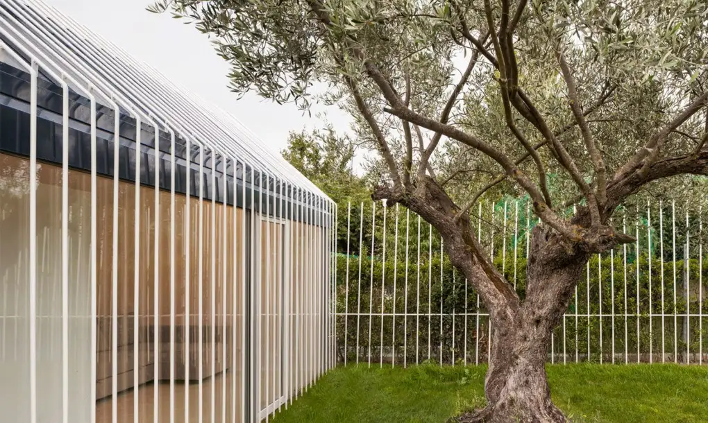 Arhitectii spanioli au prelungit fatada casei printr-un gard construit cu aceleasi tuburi metalice care inconjoara peretii locuintei. In acest mod au obtinut delimitarea perimetrului gradinii. Tuburile metalice vopsite in alb creeaza o transparenta vizibila a celor doua camere.