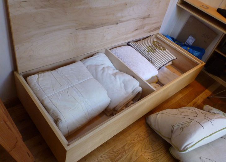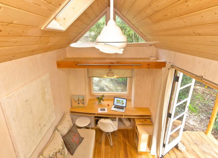 Poate dimensiunile nu impresioneaza, insa aceasta locuinta detine tot ce e necesar pentru confortul unei persoane. Mobila stratificata ajuta la eliminarea dezordinii si creeaza spatiu fara a aglomera interiorul. Cele doua usi se deschid catre curte si prelungesc livingul, favorizand patrunderea aerului curat in tot spatiul casei.