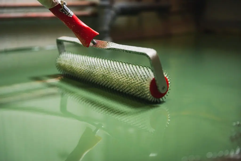 După amestecare rășina este aplicată pe pardoseala pregătită, pe substratul curățat și îndreptat, pentru ca mai apoi să fie întinsă foarte bine cu ajutorul unei raclete. Probabil vei vedea că în timpul aplicării specialiștii folosesc niște ghete speciale cu ”gheare” cu care calcă pe pardoseală. Acest lucru ajută la eliminarea aerului din structură și la uniformizare.
