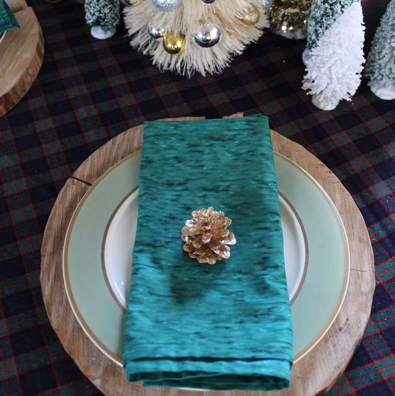 Iesi din tiparele clasice ale amenajarilor traditionale si incearca ceva diferit. Experimenteaza cu materiale diferite si textile care sa bucure simturile. Servete pentru masa de un verde menta sau turcoaz cu un con de pin deasupra poate fi un mos de a aranja masa de Craciun simplu, natural si elegant in acelasi timp.