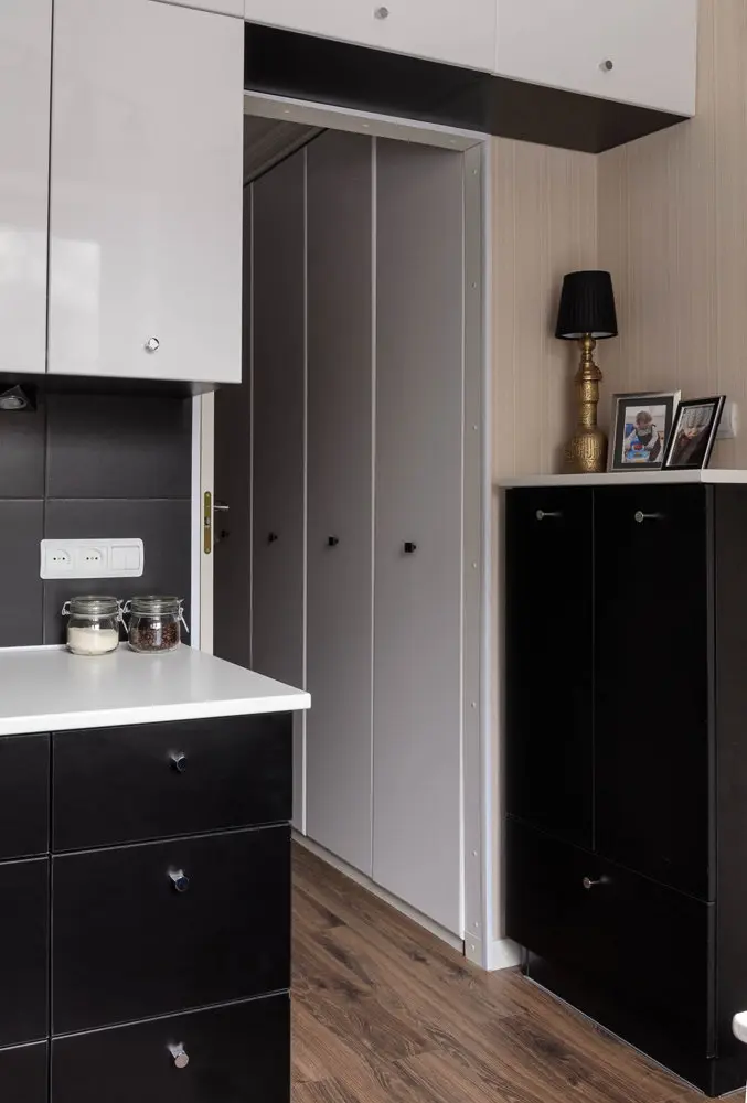 Pe langa spatiile de stocare gandite in camera, au fost create si in hol zone suplimentare. Au fost montate dulapuri inguste, cu fronturi albe care sa amplifica spatiul ingust.