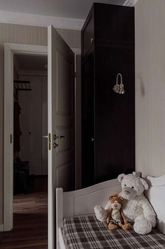 Au ales cu atentie piesele de baza, o canapea extensibila ce va fi folosita si ca pat pentru dormit, un patut-divan pentru copil si dulapuri dispuse pe peretele opus, dar si doua modele tip soldat asezate de o parte si cealalta a patului copilului.