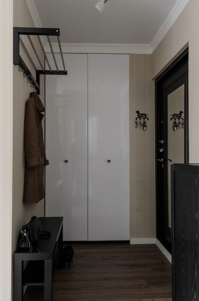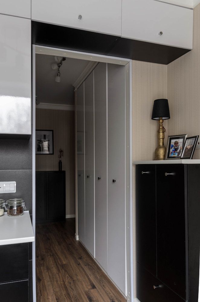 Pe langa spatiile de stocare gandite in camera, au fost create si in hol zone suplimentare. Au fost montate dulapuri inguste, cu fronturi albe care sa amplifica spatiul ingust.