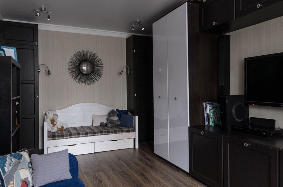 Au ales cu atentie piesele de baza, o canapea extensibila ce va fi folosita si ca pat pentru dormit, un patut-divan pentru copil si dulapuri dispuse pe peretele opus, dar si doua modele tip soldat asezate de o parte si cealalta a patului copilului.