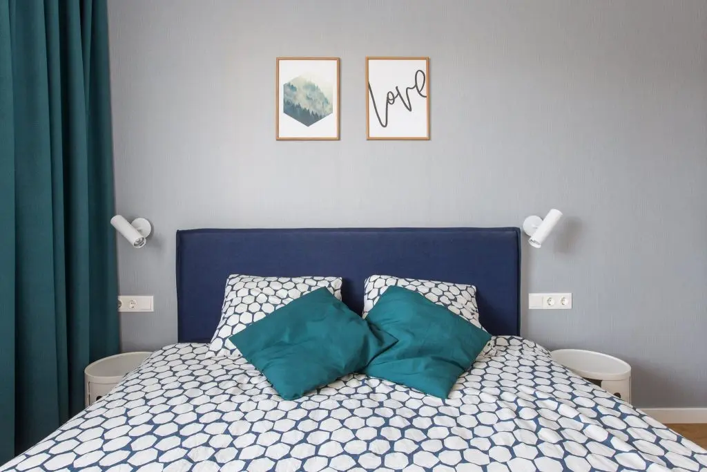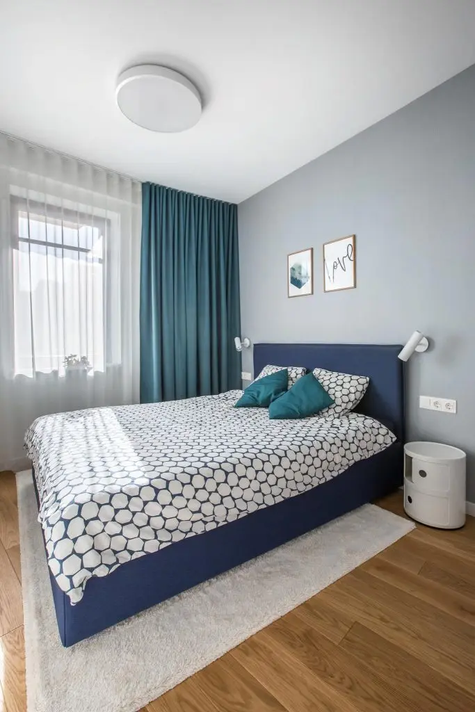 Pentru a da senzatia de continuitate in intreg apartamentul, plafonierele din living, culorile si tablourile de acelasi tipar, se regasesc si in dormitor. Aici atentia ne este atrasa de aparatia nuantelor de albastru intr-o cantitate destul de generoasa: cadru si lenjerie de pat, plus draperii.