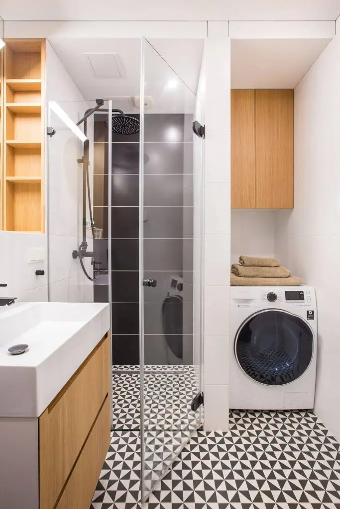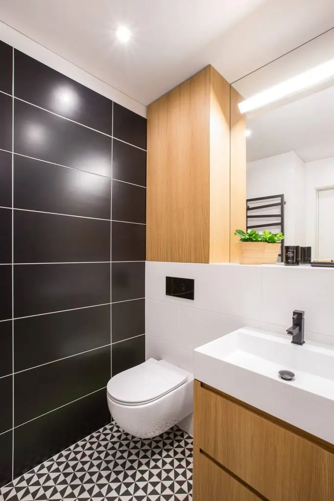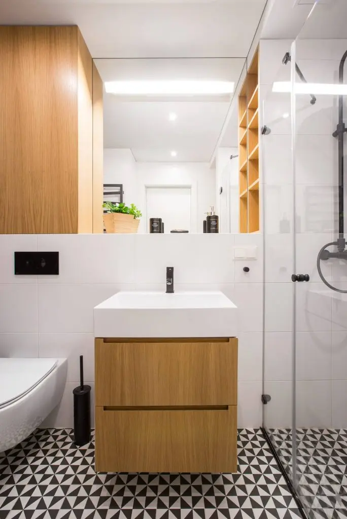 Baia, fiind separata, sparge tiparele celorlalte incaperi. Intalnim aici mobilier din lemn in nuantele parchetului de stejar, podea in forme geometrice de un alb-negru simetric si, desigur, plante decorative. Oglinda de mari dimensiuni si cabina de dus din sticla vor “complota” cu albul peretilor si lumina led-urilor si vor avea ca rezultat o baie nu doar cu un aspect modern, ci un spatiu bine conturat si marit.