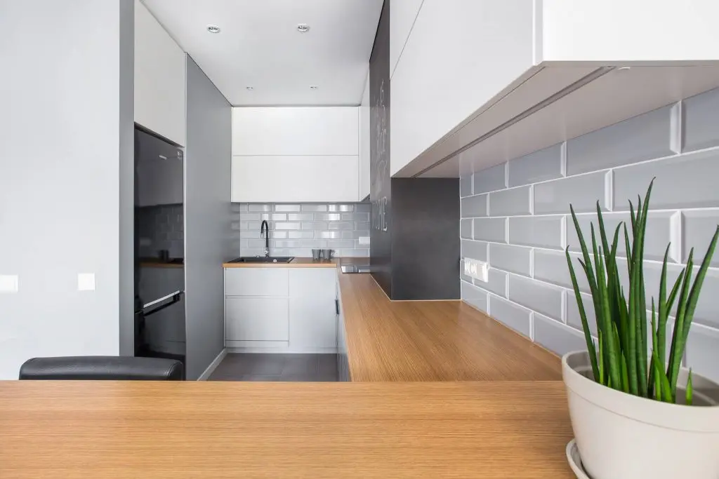 Bucataria este deschisa si separata de living printr-un mini bar conceput ca spatiu de servire, sub forma unei mese. Mobilierul este unul minimalist si incorporeaza, intr-un mod modern, o tabla de scris, ca accent de culoare al incaperii. Corpurile mobilei sunt separate printr-un ornament mural cu efect de caramida, in tonuri de gri, complementare celorlalte camere.
