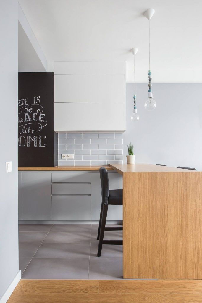 Bucataria este deschisa si separata de living printr-un mini bar conceput ca spatiu de servire, sub forma unei mese. Mobilierul este unul minimalist si incorporeaza, intr-un mod modern, o tabla de scris, ca accent de culoare al incaperii. Corpurile mobilei sunt separate printr-un ornament mural cu efect de caramida, in tonuri de gri, complementare celorlalte camere.