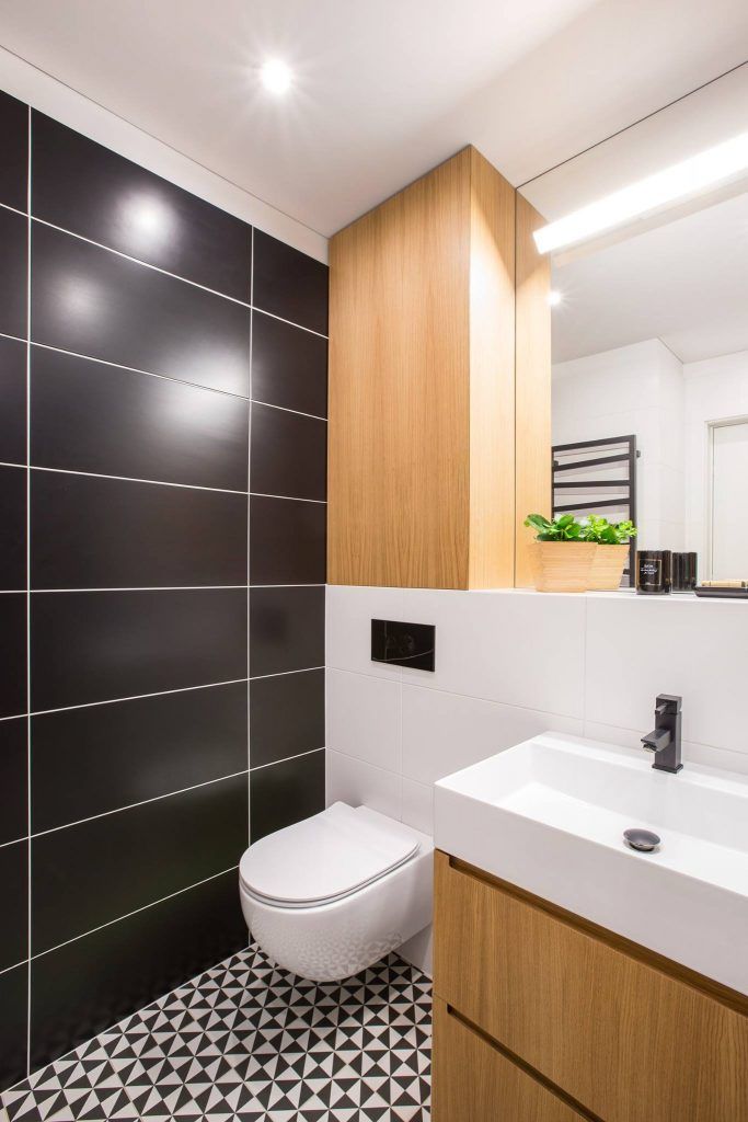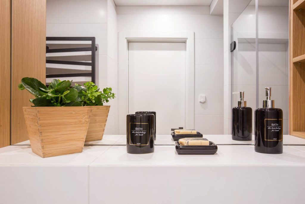 Baia, fiind separata, sparge tiparele celorlalte incaperi. Intalnim aici mobilier din lemn in nuantele parchetului de stejar, podea in forme geometrice de un alb-negru simetric si, desigur, plante decorative. Oglinda de mari dimensiuni si cabina de dus din sticla vor “complota” cu albul peretilor si lumina led-urilor si vor avea ca rezultat o baie nu doar cu un aspect modern, ci un spatiu bine conturat si marit.