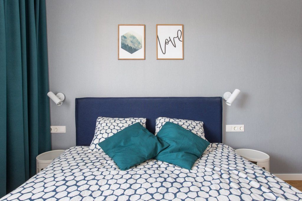 Pentru a da senzatia de continuitate in intreg apartamentul, plafonierele din living, culorile si tablourile de acelasi tipar, se regasesc si in dormitor. Aici atentia ne este atrasa de aparatia nuantelor de albastru intr-o cantitate destul de generoasa: cadru si lenjerie de pat, plus draperii.