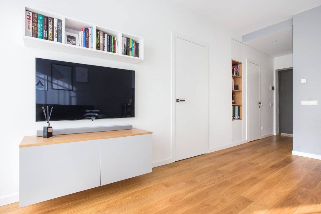 Elementele predominante in cadrul acestui proiect sunt parchetul din lemn de stejar regasit in toate camerele si nuantele murale de alb si derivate de gri.