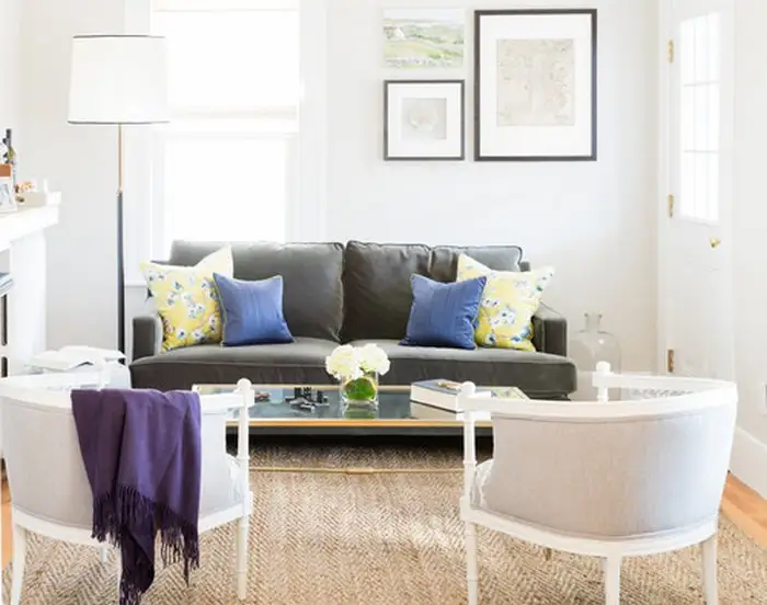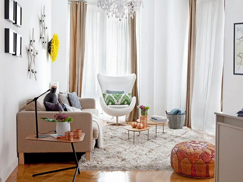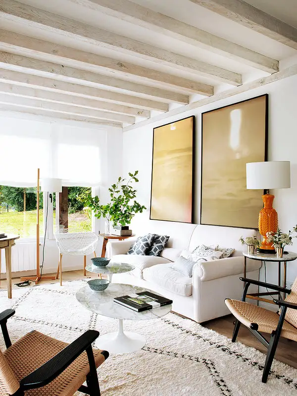 Albul este cadrul perfect pentru ca reflecta lumina si amplifica spatiul, poti adauga ulterior accentele de culoare preferate fie la nivelul canapelei, pernelor decorative sau al decoratiunilor. Poti adauga tablouri cu rame negre (ofera o nota eleganta incaperii), un covor cu un tipar geometric sau colorat sau draperii intr-o nuanta puternica, saturata.