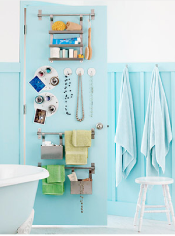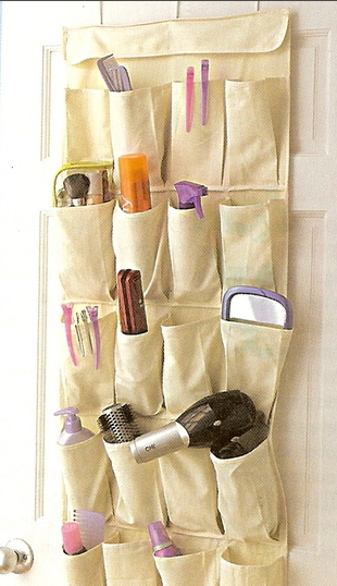 Pe spatele usii se poate pune un cuier, sau se poate atasa un organizator confectionat din material textil. Astfel va puteti agata halatul de baie si alte obiecte de imbracaminte, sau va puteti pune in acest organizator pana si cele mai marunte obiecte din baie.