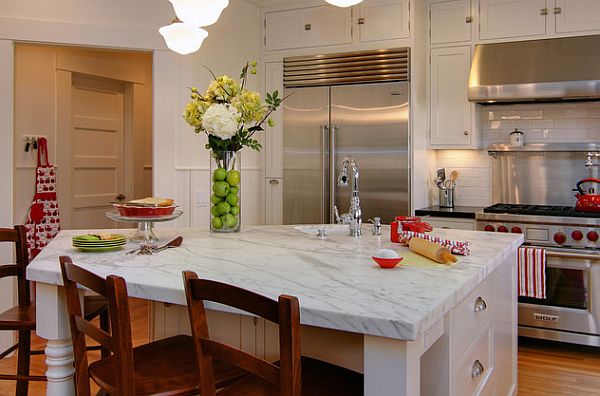 Diversele soiuri de mere, dispuse frumos intr-un cos de fructe, vor decora orice masa de familie. Aceleasi mere, preferabil verzi, dispuse intr-o vaza inalta, transparenta, peste care puteti sa adaugati flori vor infrumuseta decorul din bucatarie, facandu-l mai proaspat, mai vesel.