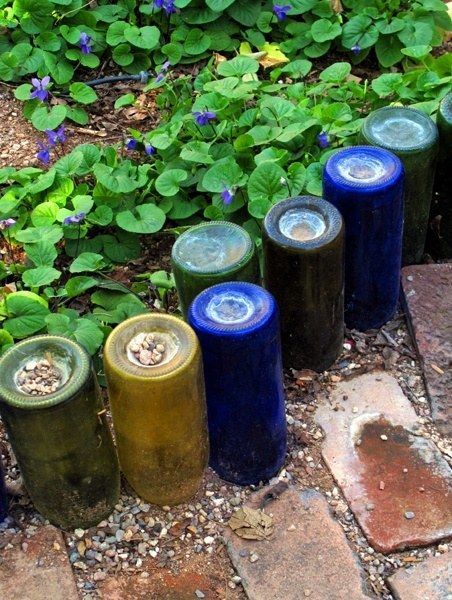 Sticle de vin infipte in pamant pentru a crea alei in gradina