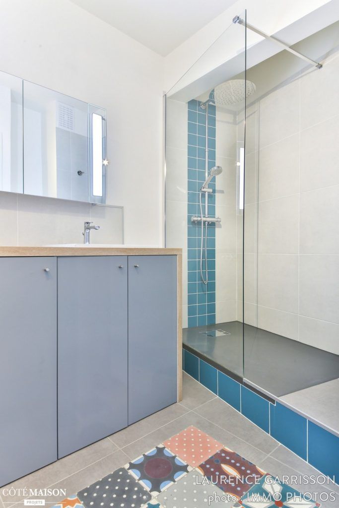 Albastrul este culoarea predominanta a baii, iar jocul placilor patchwork din mijlocul pardoselii completeaza nota jucausa, dinamica a unui spatiu asa mic precum cel din aceasta baie.