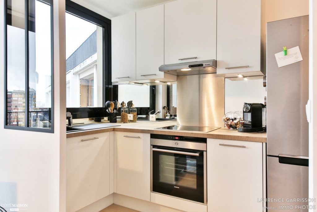 Bucataria este una restransa, dar micile trucuri la care Laurence a apelat ne arata ca poti sa te descurci si intr-un astfel de spatiu. In dreptul geamului din bucatarie, a fost instalata chiuveta, iar pe cealalta latura a mobilierului (in forma de L) dulapuri pentru depozitare, plita si cuptorul.
