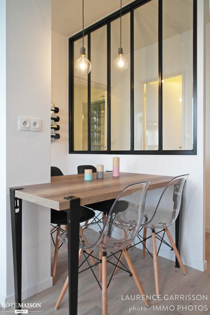 Loc de luat masa cu blat din lemn si picioare din otel realizate pe comanda. Scaunele cu sezut transparent sunt o idee ingenioasa utile pentru un spatiu mic