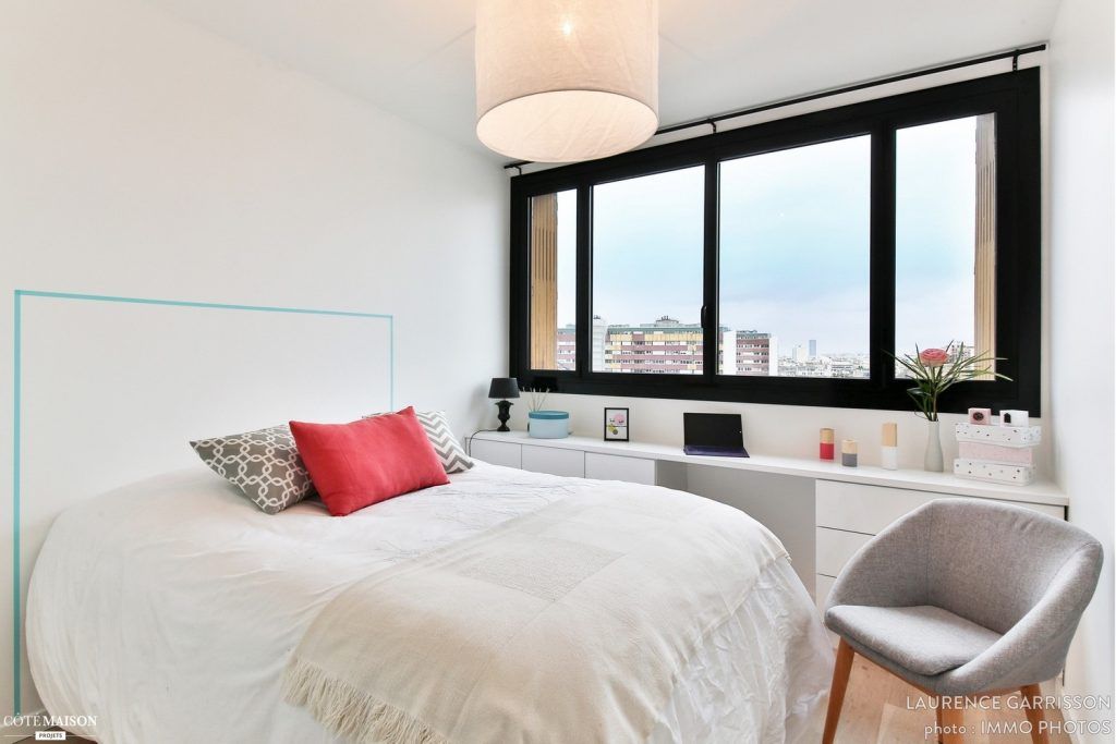In dormitor, locul unui dulap a fost luat de corpurile de mobila montate sub fereastra, iar deasupra lor un blat care functioneaza si ca birou.