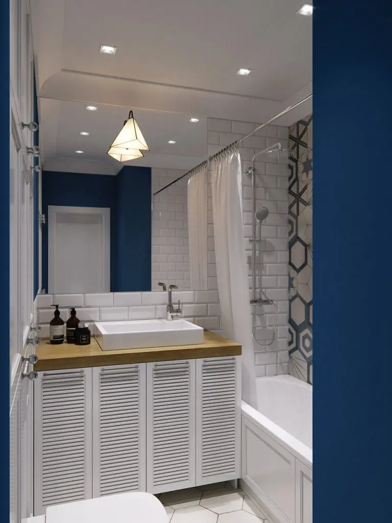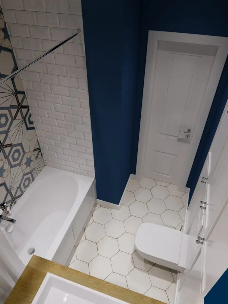 Singurele modificari notabile au fost realizate in hol, micsorand putin din spatiul baii pentru a integra un dulap langa usa de la intrare. Cu toatea acestea, baia a ramas cu aproximativ 4 metri patrati, eficient utilizati. Pe cat posibil, si aici designerul a creat spatii de depozitare, o parte in nisa din spatele vasului de toaleta si o parte sub lavoar. Albul si albastrul fac casa buna impreuna in aceasta baie, oferind un ambient placut.