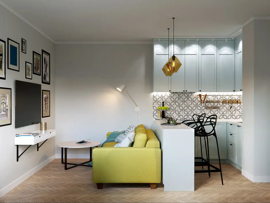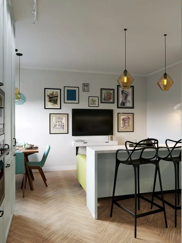 Designerul a gandit astfel o camera multifunctionala. In cei 16 metri patrati gasim bucatarie, loc de luat masa, zona de bar si un living mic, cu o canapea si zona T V. Desi ar putea parea ingramadit, fiecare functiune in parte este bine pusa in valoare si cumva, delimitata vizual prin pozitionarea mobilierului. Dintre toate, bucataria este cel mai bine valorificata.
