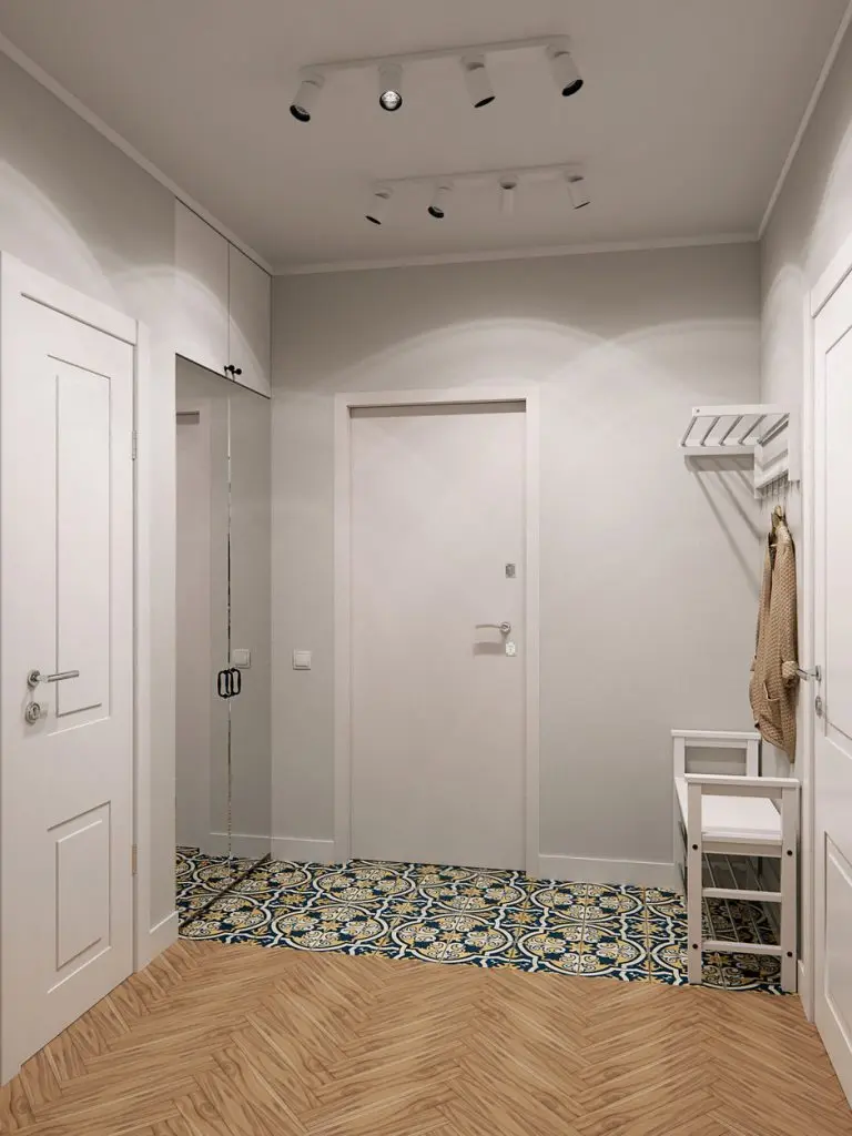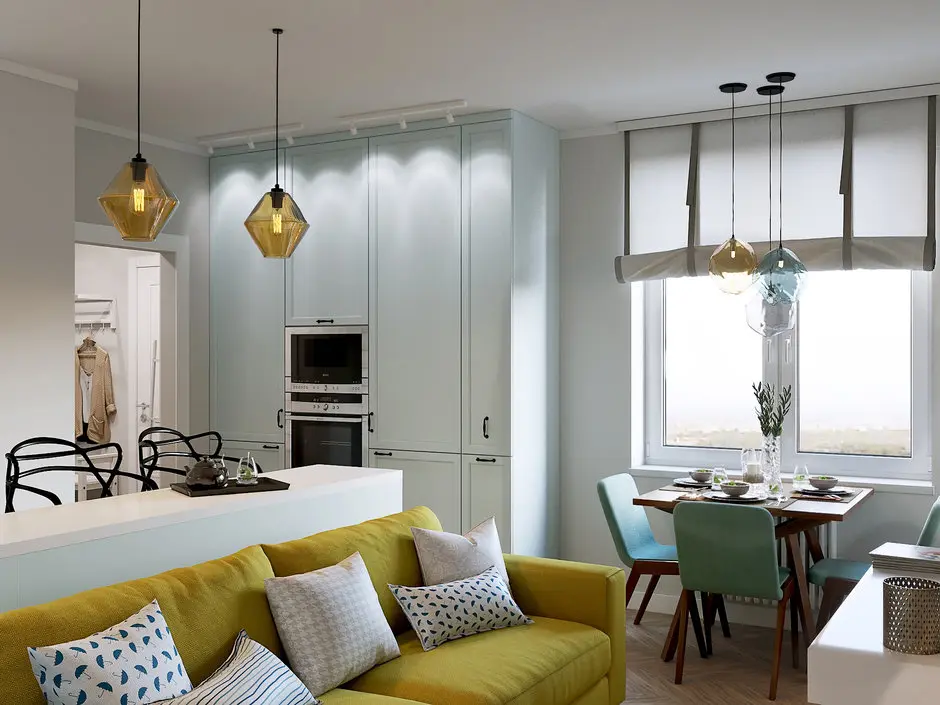 Pentru ca tot spatiul sa fie cat mai luminos, designerul a optat pentru culori deschise si accente de galben si albastru care imprima un plus de dinamica incaperii. Imprimeul jucaus al placilor din bucatarie impreuna cu aceste tuse colorate fac ca spatiul sa para mai vesel, mai primitor. Si iluminatul artificial isi are rolul determinant prin varietatea de corpuri integrate, accentul fiind pus inca o data pe zona bucatariei.