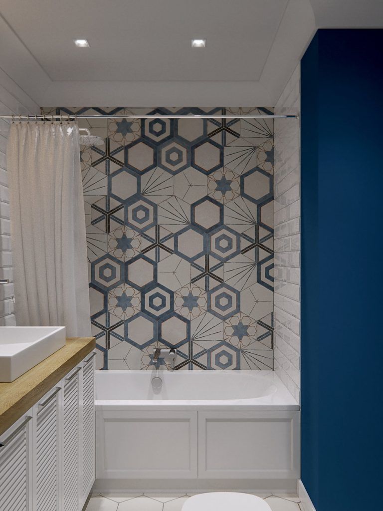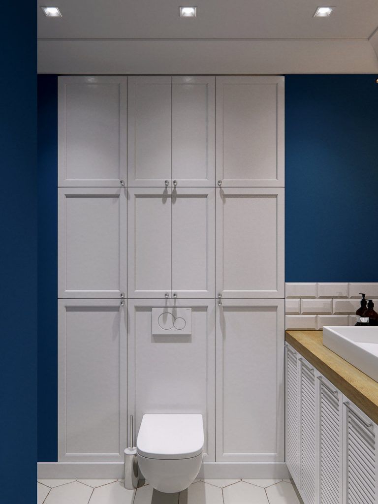 Singurele modificari notabile au fost realizate in hol, micsorand putin din spatiul baii pentru a integra un dulap langa usa de la intrare. Cu toatea acestea, baia a ramas cu aproximativ 4 metri patrati, eficient utilizati. Pe cat posibil, si aici designerul a creat spatii de depozitare, o parte in nisa din spatele vasului de toaleta si o parte sub lavoar. Albul si albastrul fac casa buna impreuna in aceasta baie, oferind un ambient placut.